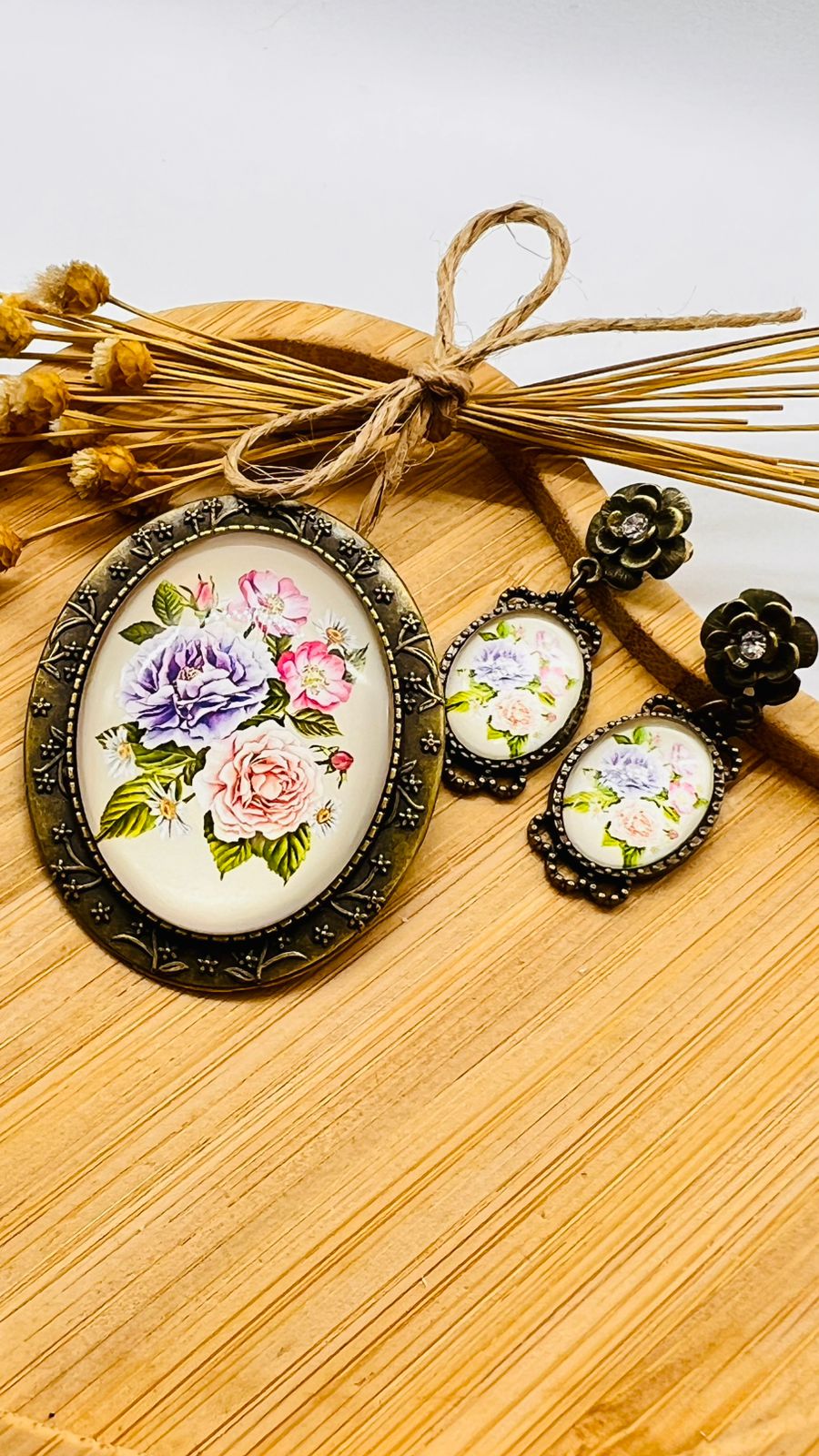 Descrição/ Finalidades: Conjunto retrô composto de brincos de pino e broche na cor bronze com o camafeu/ cabochão de resina com decalque floral. Perfeito para usar com trajes de época, prendas, fridas, trajes folclóricos ou dar um toque especial e único ao seu visual.