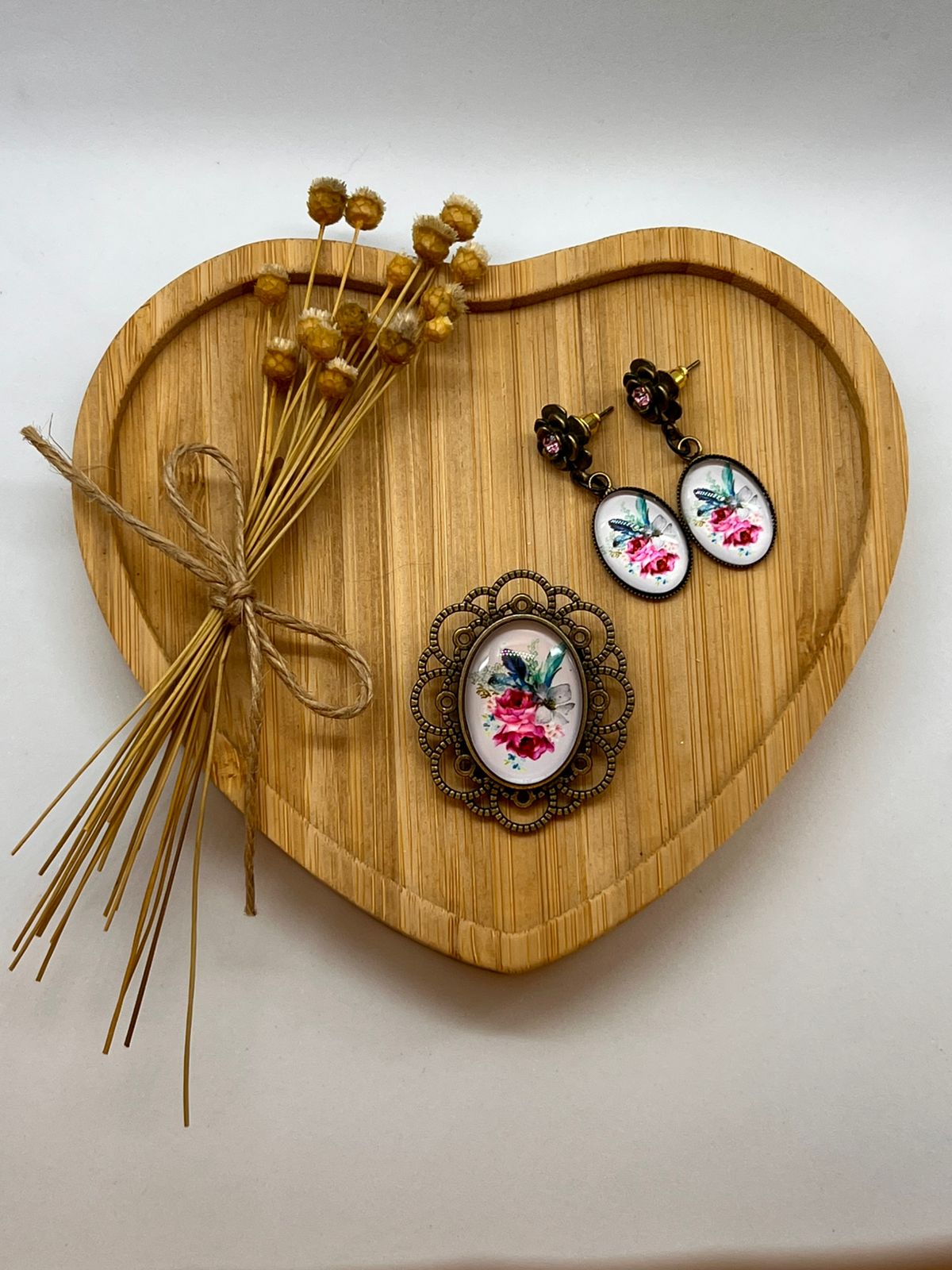 Descrição/ Finalidades: Broche e brincos retrô na cor bronze com o detalhe interno predominando as cores rosa, azul e verde. Perfeito para usar com trajes de época, prendas, fridas, trajes folclóricos ou dar um toque especial e único ao seu visual. Não se trata de produto pintado a mão.