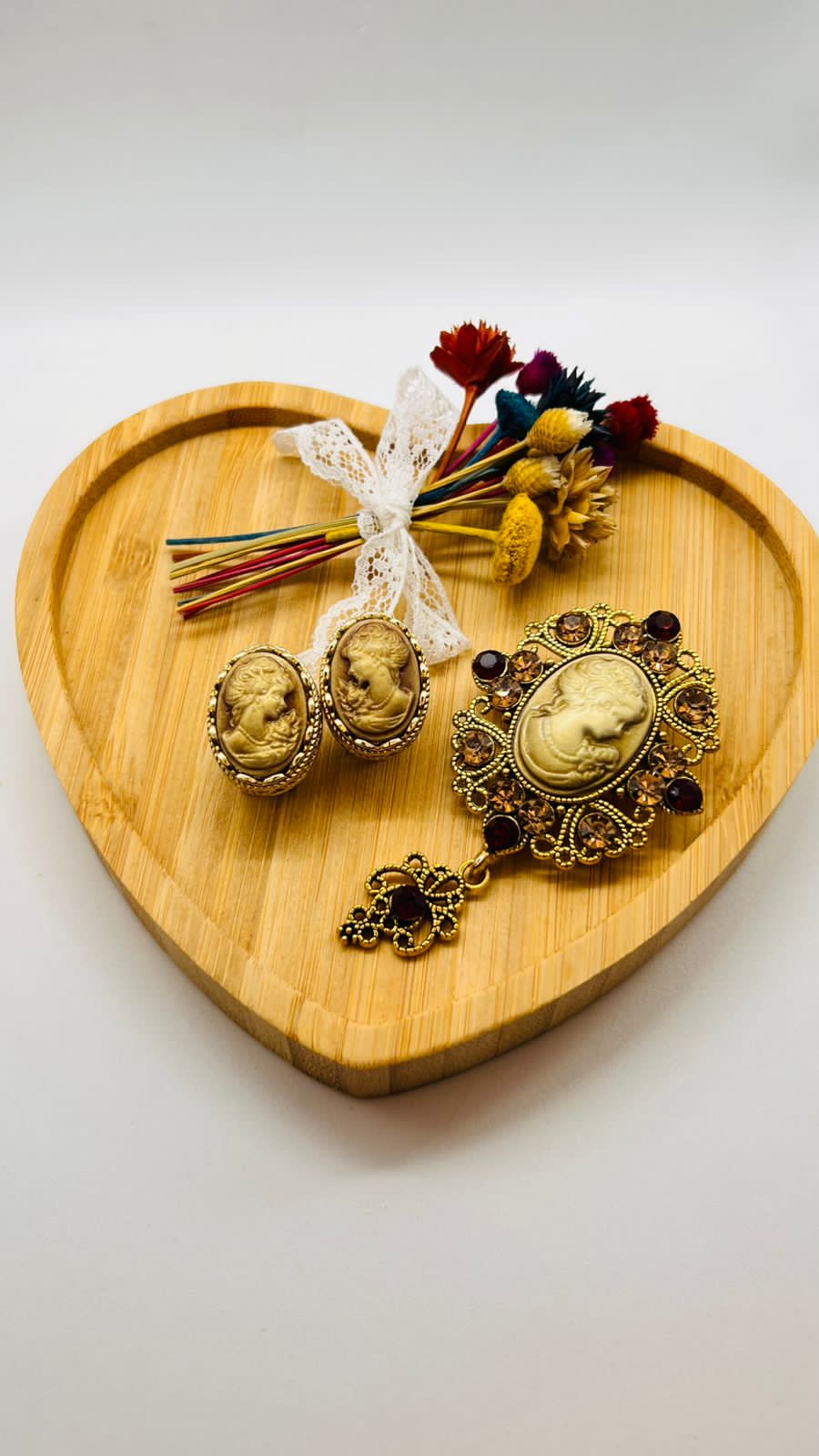 Descrição/ Finalidades: Broche e brincos retrô na cor dourada envelhecido com o camafeu em tons de marrom. Perfeito para usar com trajes de época, prendas, fridas, trajes folclóricos ou dar um toque especial e único ao seu visual.