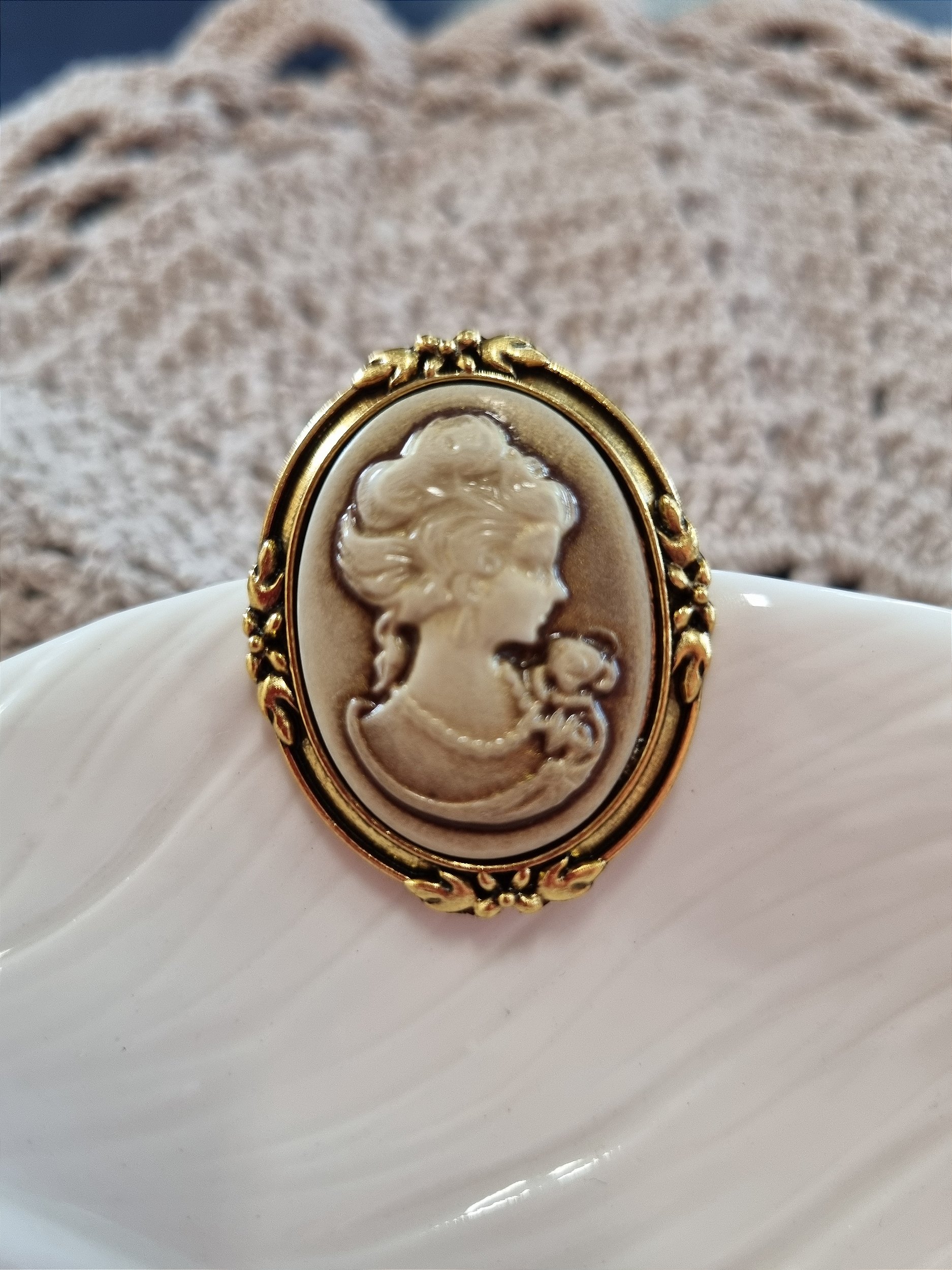 Descrição/ Finalidades: Broche retrô na cor ouro envelhecido com o camafeu degradê marrom. Perfeito para usar com trajes de época, prendas, fridas, trajes folclóricos ou dar um toque especial e único ao seu visual.