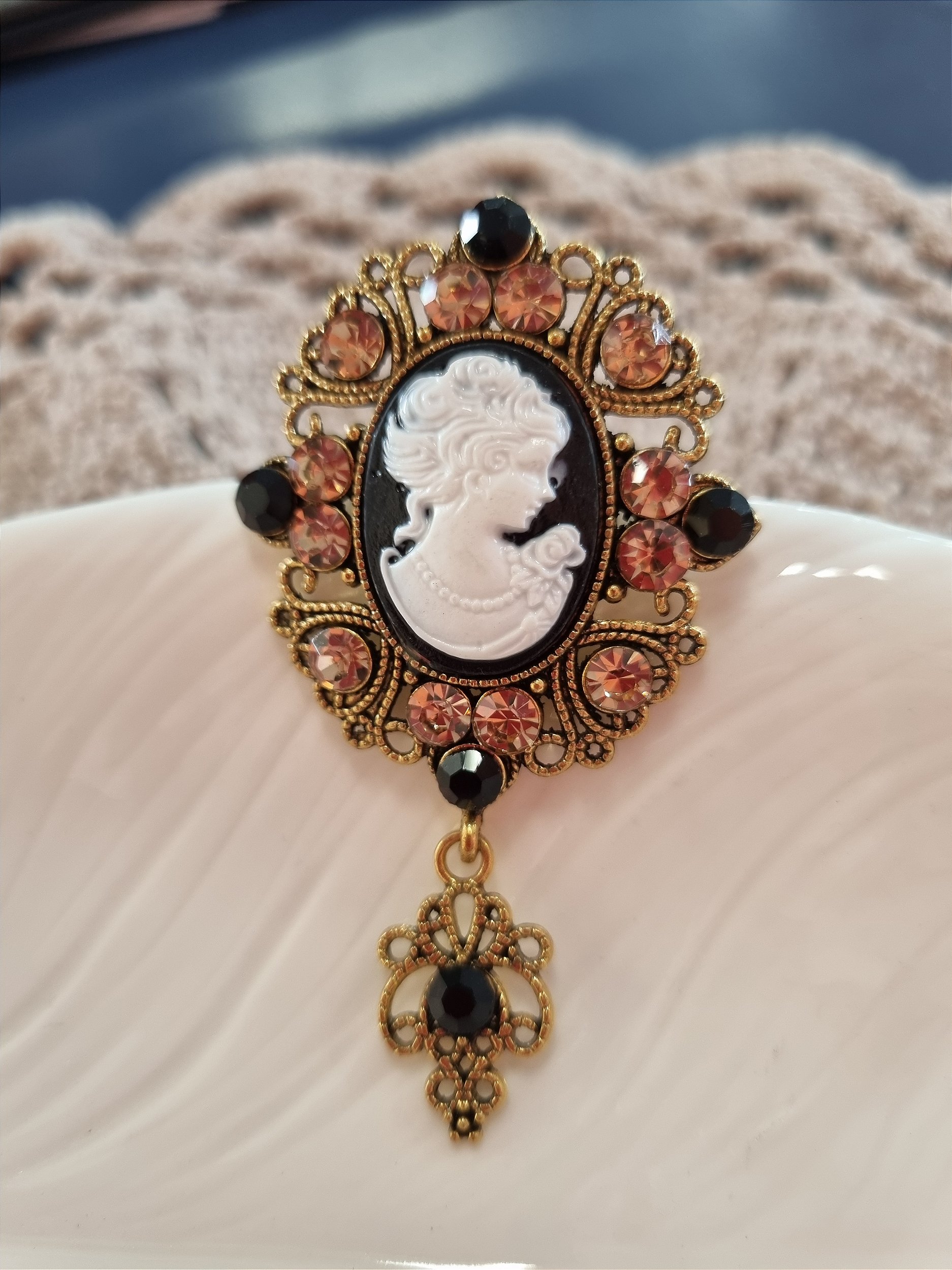 Descrição/ Finalidades: Broche na cor dourada envelhecido com o camafeu com fundo preto e detalhe branco, com strass preto e dourado. Perfeito para usar com trajes de época, prendas, fridas, trajes folclóricos ou dar um toque especial e único ao seu visual